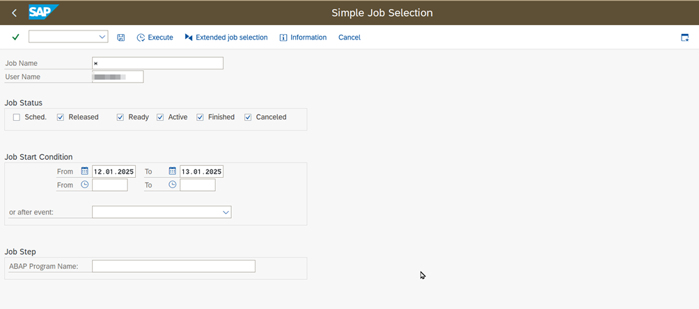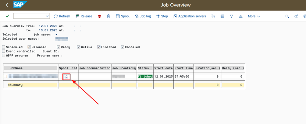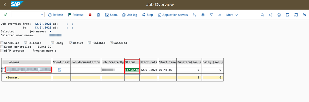 - Go to the job display screen with the transaction code “SM37”.
