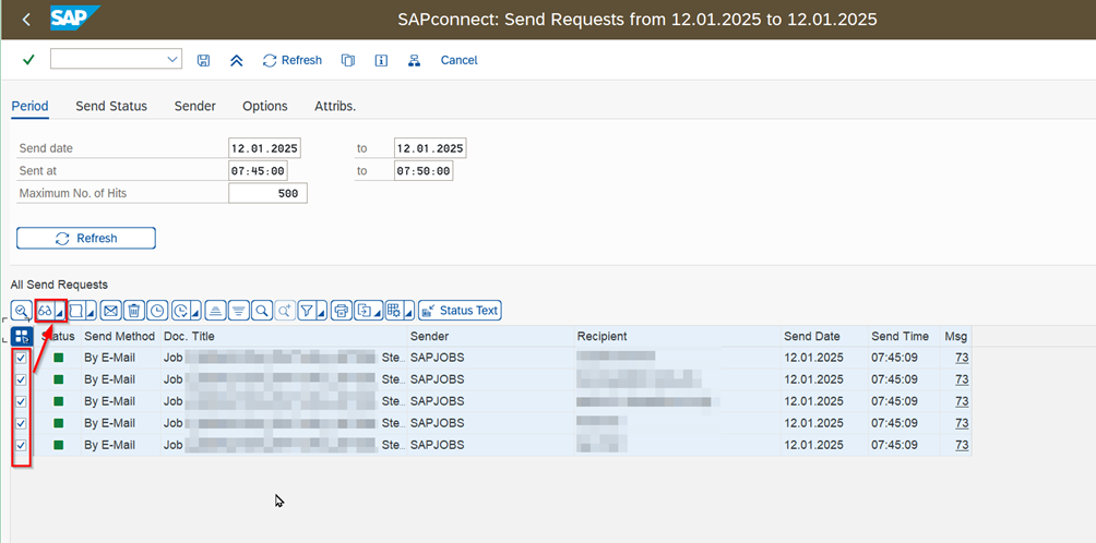 - Select the relevant rows and click on the button to see the inside of the mails sent.