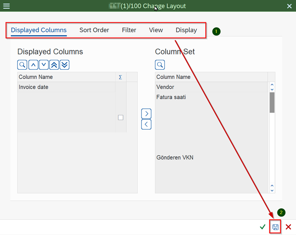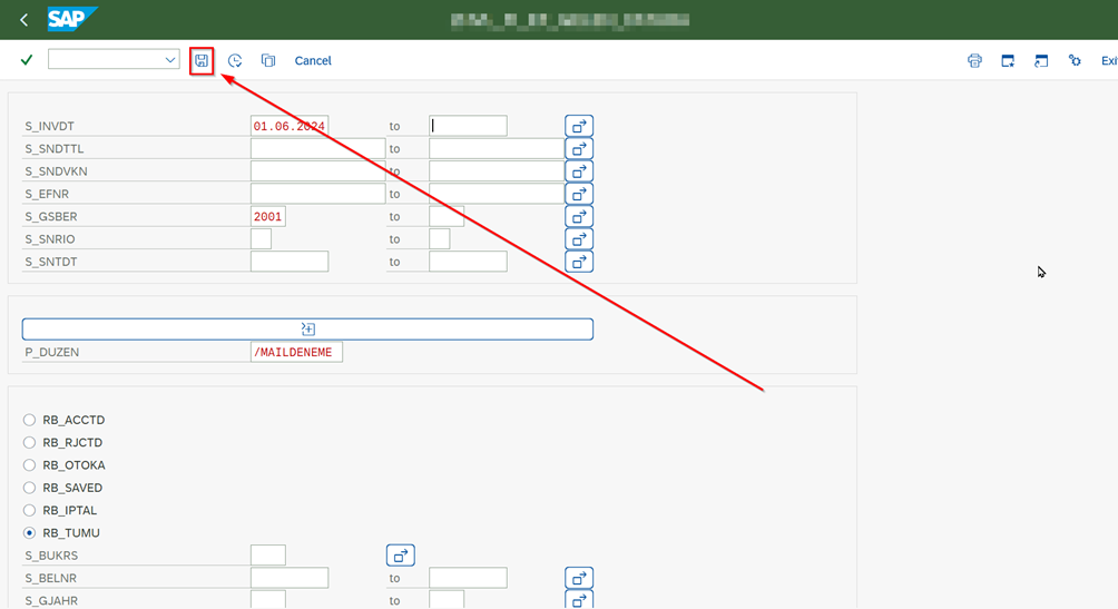 - After entering the other report parameters, click on the “Save” button and the variant is saved.