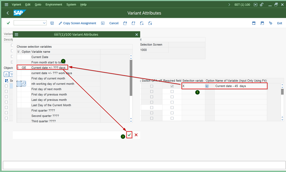 - After clicking the Save Variant button, the selection variable can be entered and the date field can be filled accordingly.
