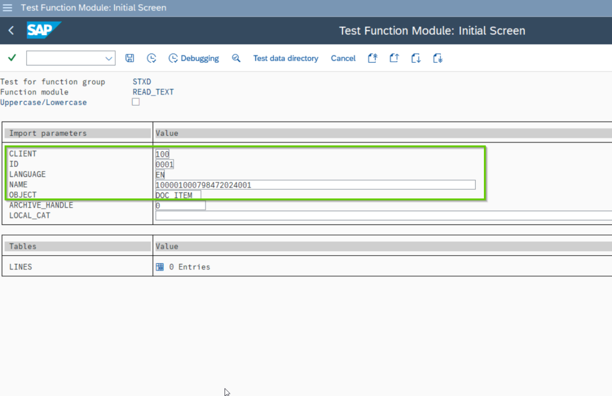 2. Executing the READ_TEXT Function Module: Long texts are retrieved from the database using the READ_TEXT function module. The function requires the input of four key parameters, which can be obtained from the STXH table. To execute the function module: